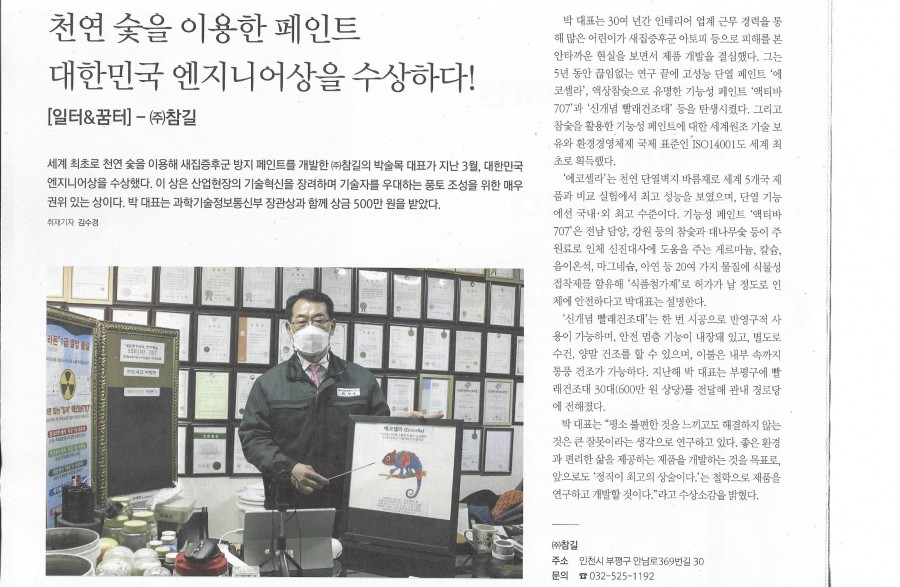 지역신문 부평사람들 게재 " 천연 숯을 이용한 페인트 대한민국 엔지니어상을 수상하다! " 페이지 정보 작성자 최고관리자 작성일21-04-28 15:57 조회37,563회 댓글0건 관련링크 본문 2021년4월25일 지역신문 부평사람들 게재 댓글목록 등록된 댓글이 없습니다. 이전글 다음글 목록