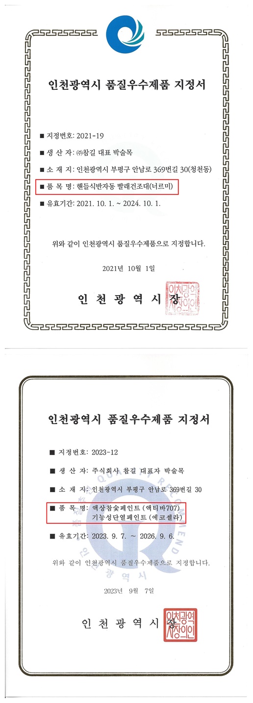 인천광역시 품질우수제품 지정서 (너르미, 액티바707, 에코셀라)